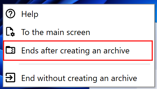 - Windows終了時に書庫を作成するには、このソフトウェアを常駐したまま、ログオフ、再起動、またはシャットダウンを行います。