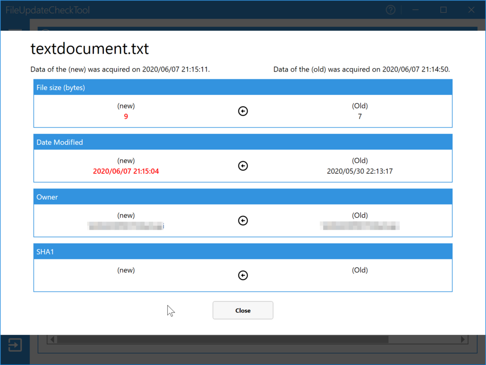 比較する情報は、更新日時、サイズ、所有者、SHA1(*)から選べます。