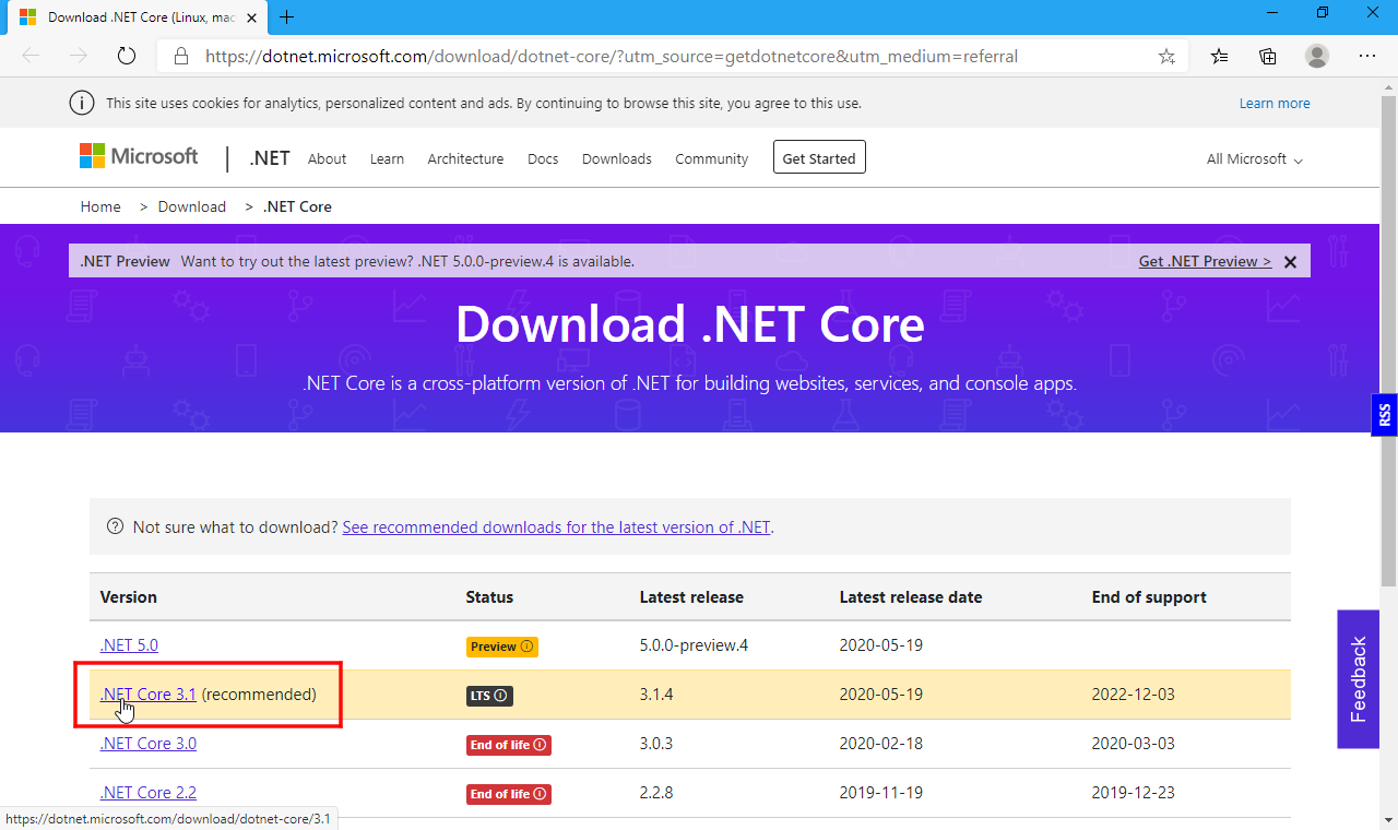 または「 https://dotnet.microsoft.com/download/dotnet-core」をブラウザで開く。