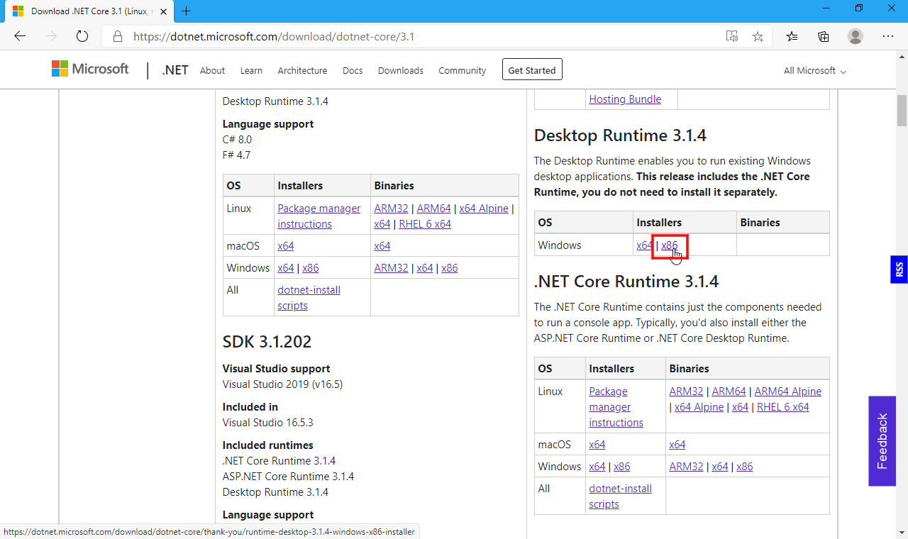 (4)「Desktop Runtime」の「x86」をクリックしダウンロード