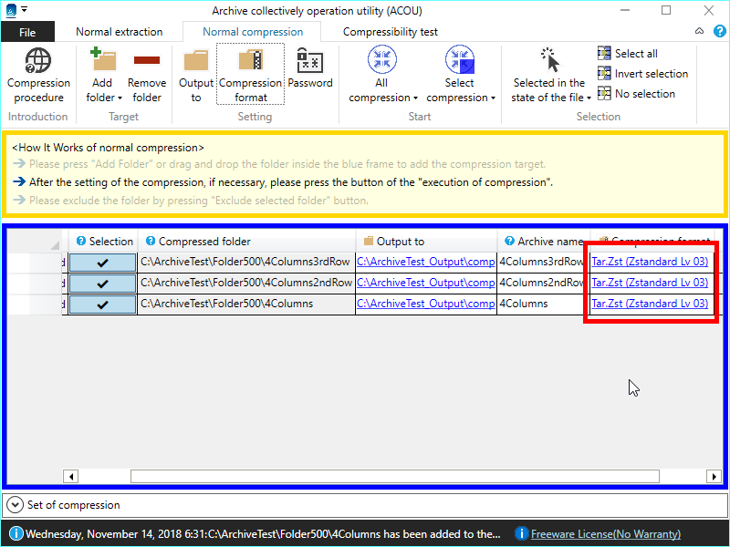 「書庫一括操作ユーティリティ(英語:Archive collectively operation utility)」で、フォルダをBrotli形式、またはZstandard形式で圧縮する方法を説明します。