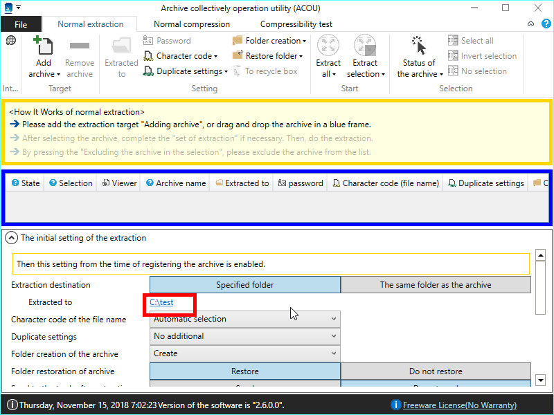 「書庫一括操作ユーティリティ(英語:Archive collectively operation utility)」で、「通常解凍」のデフォルト登録状態を変更する方法を説明します。