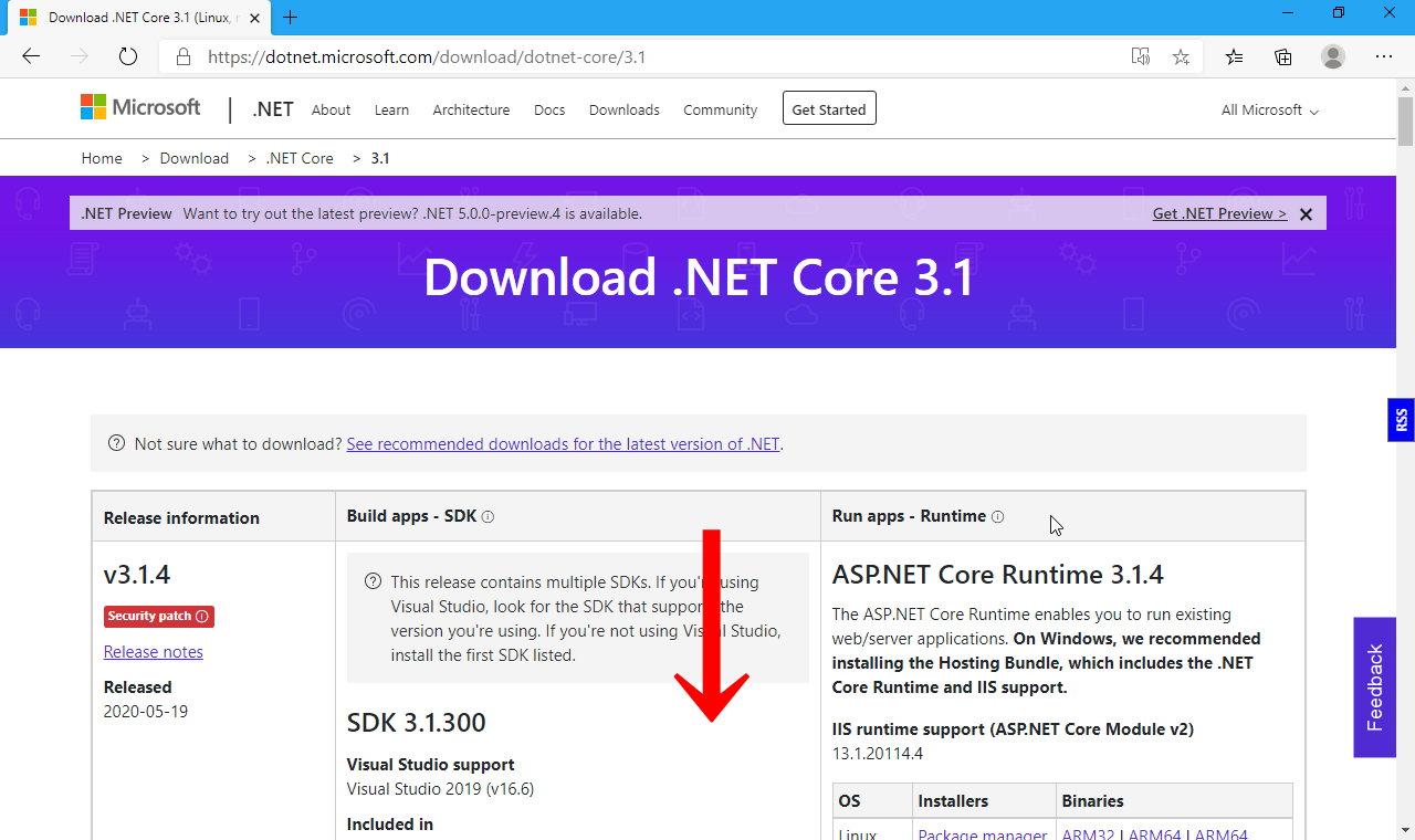 (3)「Desktop Runtime」のダウンロードリンクが見えるまでスクロールする